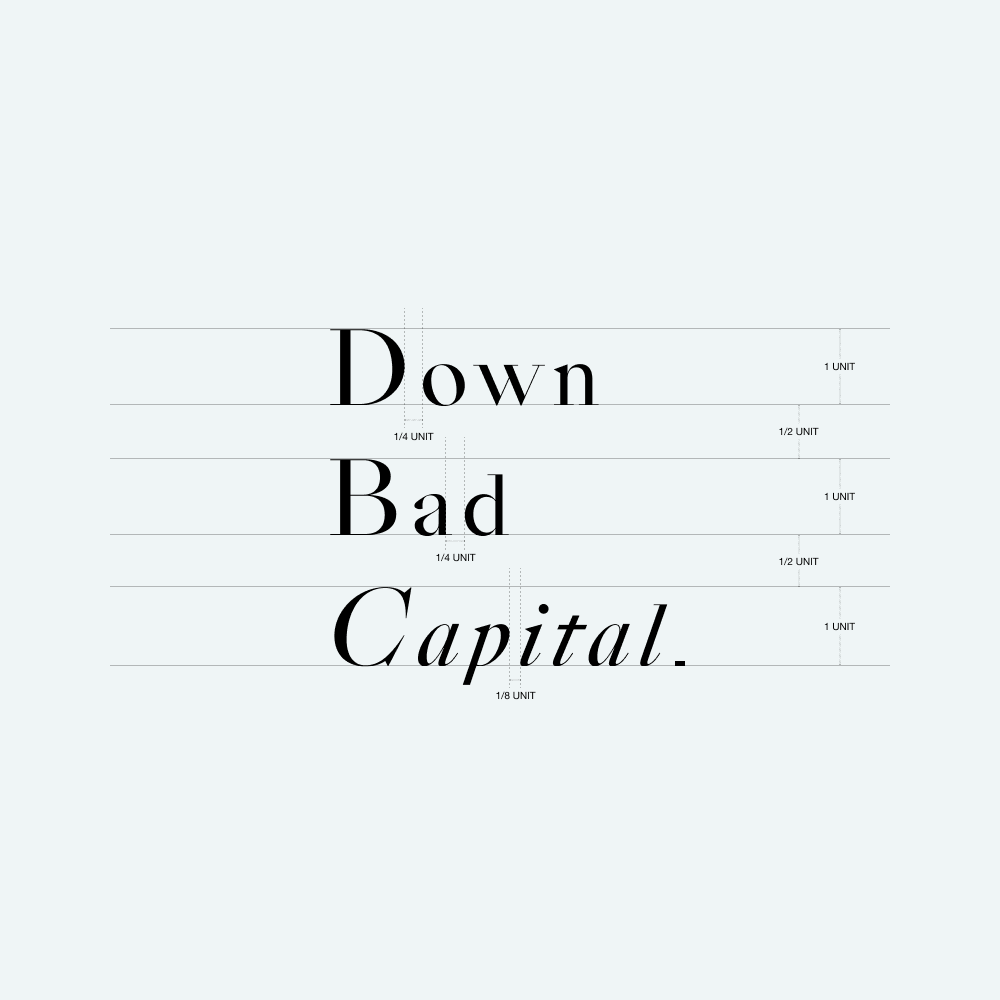 Custom wordmark, visual identity, print collaterals, and an in-progress website for Down Bad Capital (D.B.C.), a community and fund operating in the cryptocurrency space.